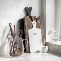 Letisztult, fehér porcelán „vágódeszka” szív alakú kivágással a nyélen – egyszerre praktikus és dekoratív darab a konyhában. Tökéletes tálaláshoz: sajtokhoz, süteményhez, falatkákhoz, reggelihez vagy egy hangulatos kávés-uzsonnás összeállításhoz. A minimalista motívum (apró szív / finom minta) szépen illik a Bastion Collections porcelánjaihoz.